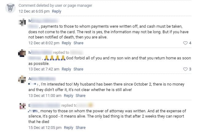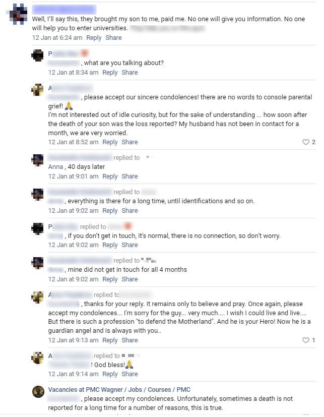 One of many user posts previously found on the Wagner Group recruitment page (before it was taken down) would be from the wives or mothers of fighters expressing concern for the whereabouts of their relatives. Typically, community administrators or Wagner Group followers would discredit the authenticity of such claims.