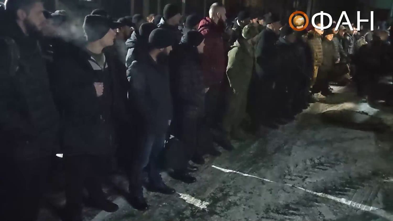 - 00:00 – 00:10s: The video – filmed in the dark – shows groups of men standing in formation.
