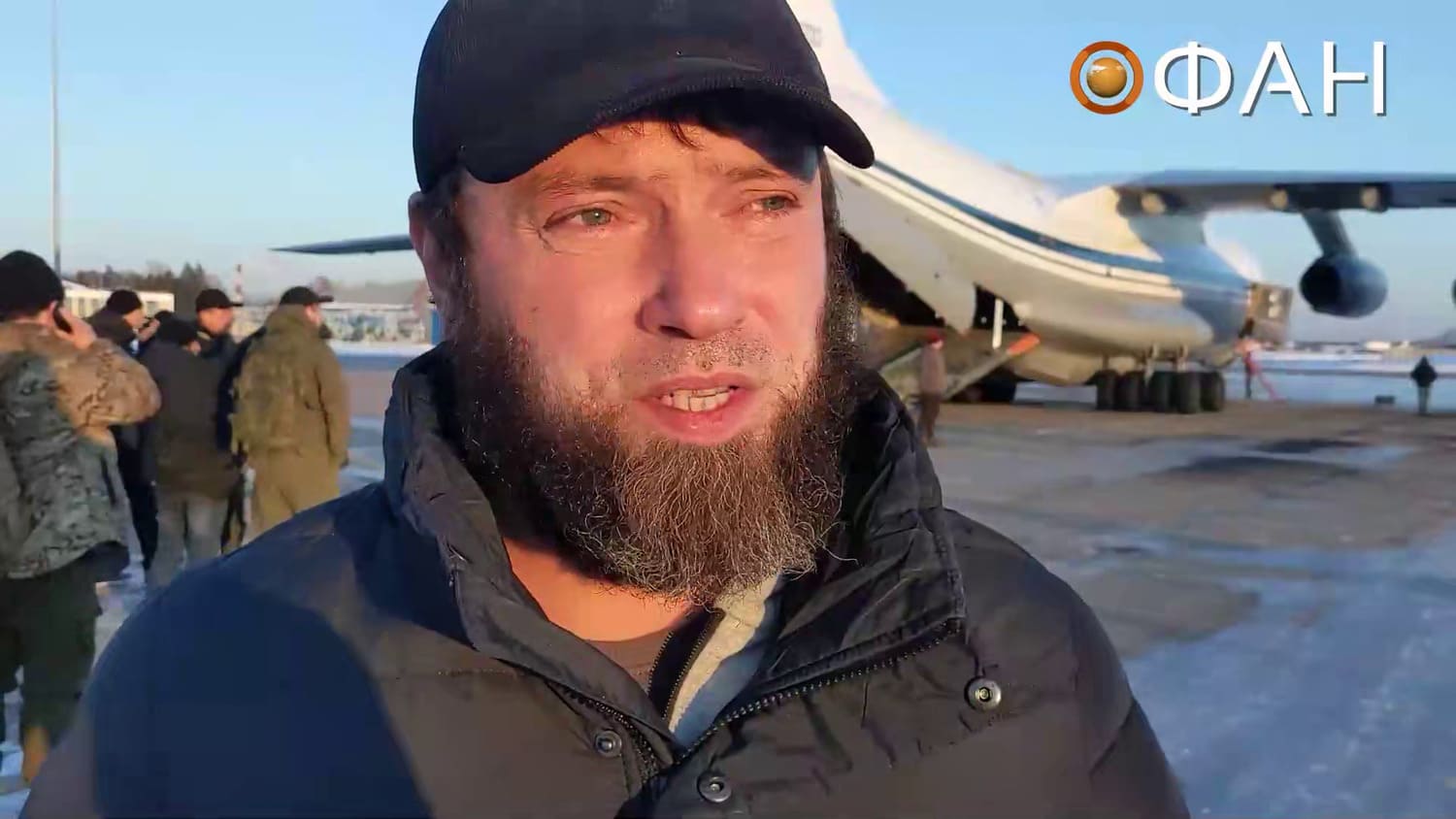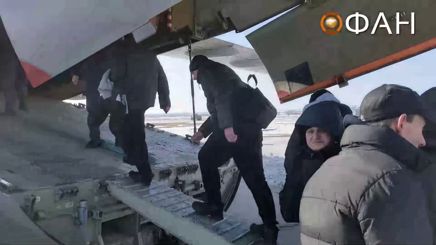 - 01:39 – 02:10s: The transport aircraft’s loading ramp is seen being lowered at an airfield. One prisoner is observed being interviewed on camera while the aircraft is seen being refuelled.