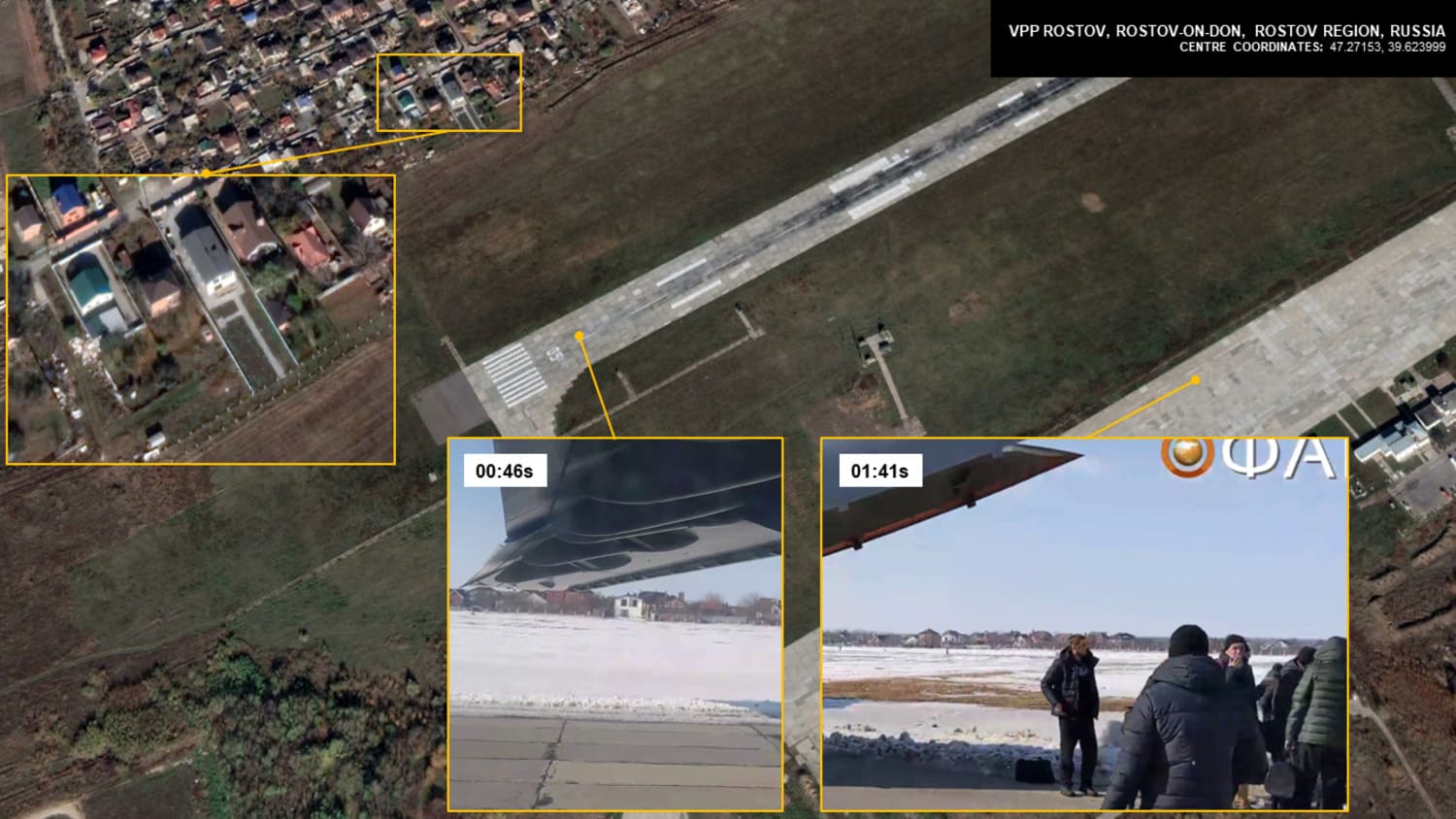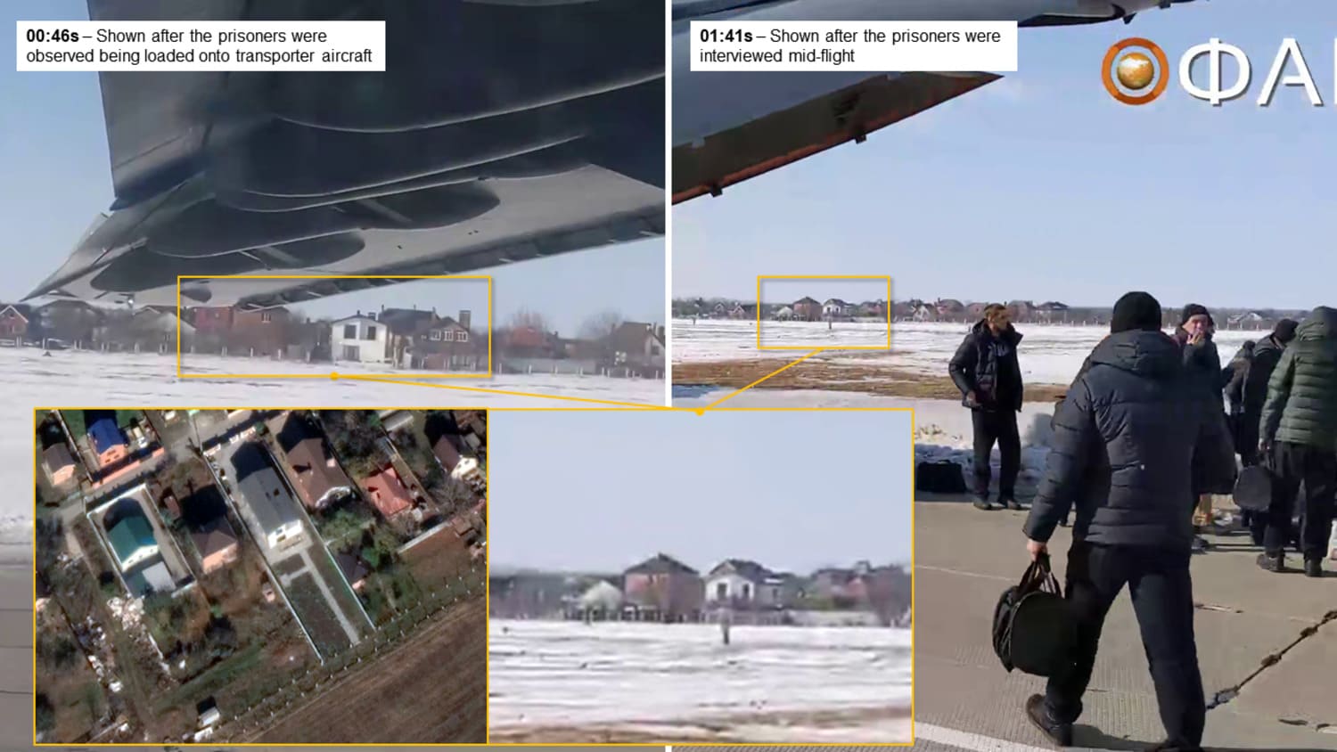 The most striking observation from the video is that the activity shown and the timings from where they appear are inconsistent. For example, at 00:48s, the camera shows the transport aircraft on the runway of Rostov-on-Don air base with a close-up view of a set of distinguishable houses. Later at 01:41s, the camera shows the same houses from a distant observation point which is visually consistent with the aircraft being located at the apron of the airport. This is interesting as the video makes it appear that the prisoners were loaded onto the transport at 00:26s of the video, being interviewed mid-flight from 00:40s, and then loaded onto waiting coaches from 01:41s. However, the order of video segments could have been easily misplaced in order to create a longer video length (as is often the case!).